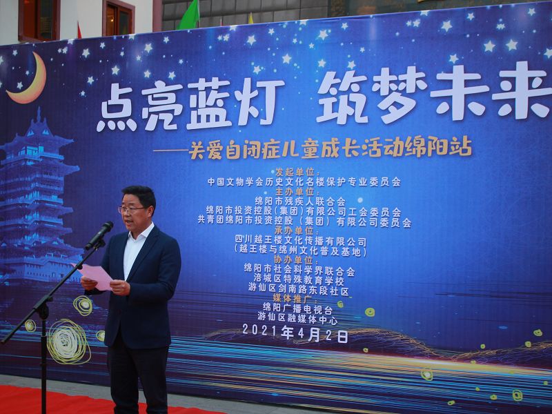2021年4月2日是第14个世界自闭症日。由中国文物学会历史文化名楼保护专业委员会发起,市残联和绵投集团工会、团委主办、越王楼文化传播公司承办的“点亮蓝灯 筑梦未来”关爱自闭症儿童成长活动绵阳站在越王楼景区广场隆重举行,旨在通过16大中国历史文化名楼于19时30分共同点亮蓝灯的行动,号召全社会关注、关爱、理解自闭症儿童,为他们健康、平等发展提供更有利条件,促进社会和谐进步。